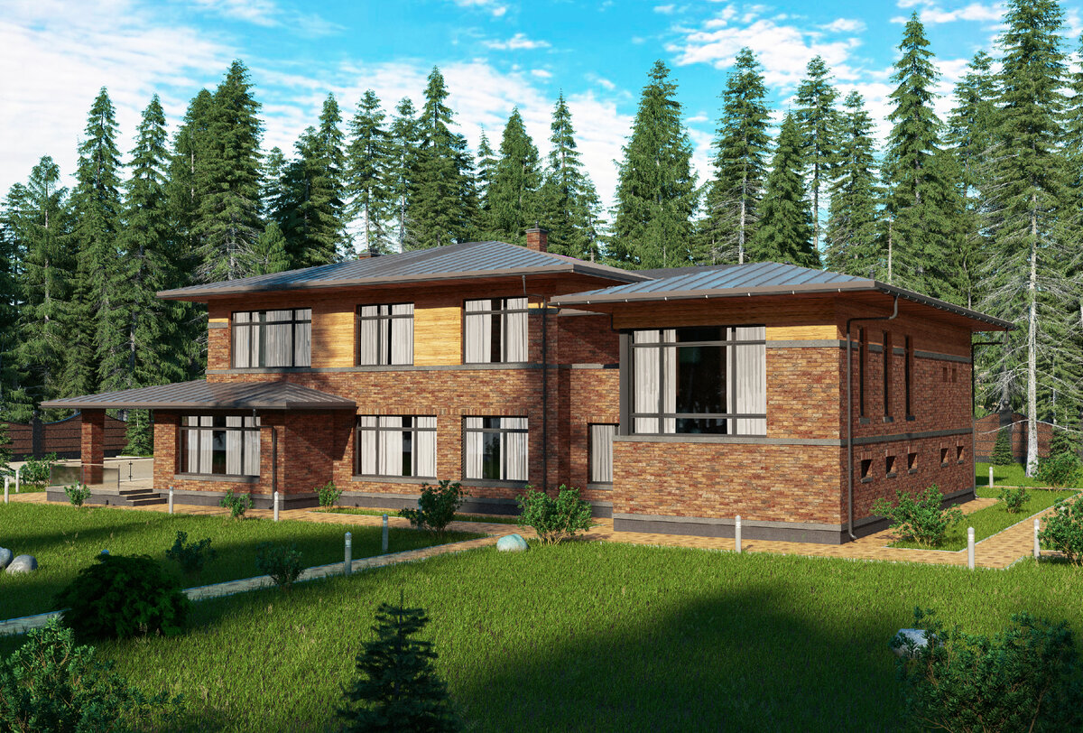 Сегодня хотим познакомить вас с одним из наших объектов в коттеджном поселке Репино парк. Заказчик обратился к нам с уже разработанным индивидуальным проектом загородного дома по мотивам архитектуры Ф.Райта. Отличительная черта этого интересного проекта – разноуровневость планировки. Дом состоит из двух объемов, соединенных лестничным холлом и крытой террасой второго этажа. В первом блоке разместились все необходимые жилые помещения, а во втором блоке расположились спа-зона с бассейном и тренажерный зал.