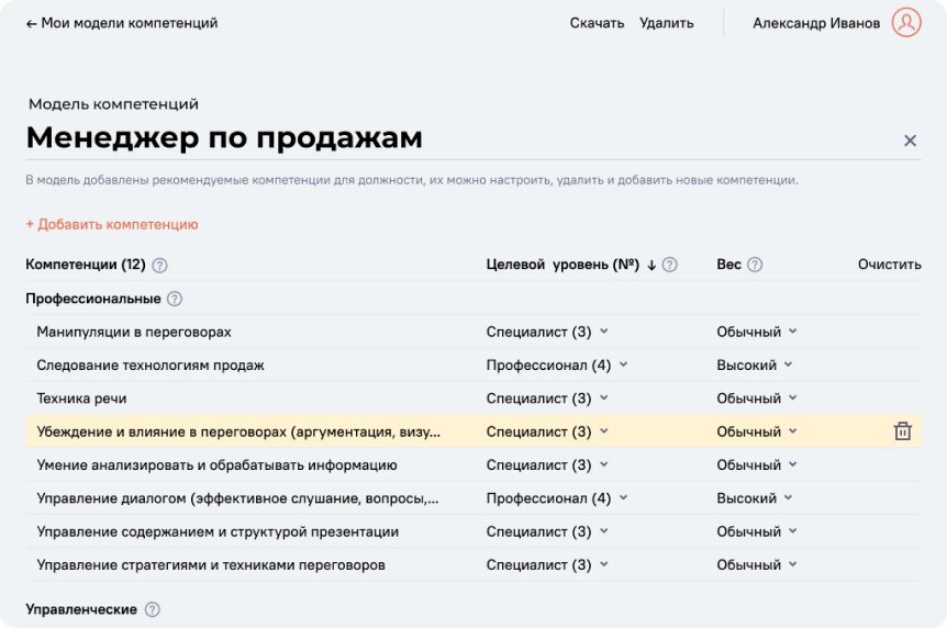 Предположим, руководителю важно, чтобы менеджер по продажам обладал навыками убеждения и влияния в переговорах. Тогда (1) воспользуйтесь типовой моделью компетенций Менеджера по продажам и (2) выберите в ней компетенцию «Убеждение и влияние в переговорах (аргументация, визуализация и т.д.)».