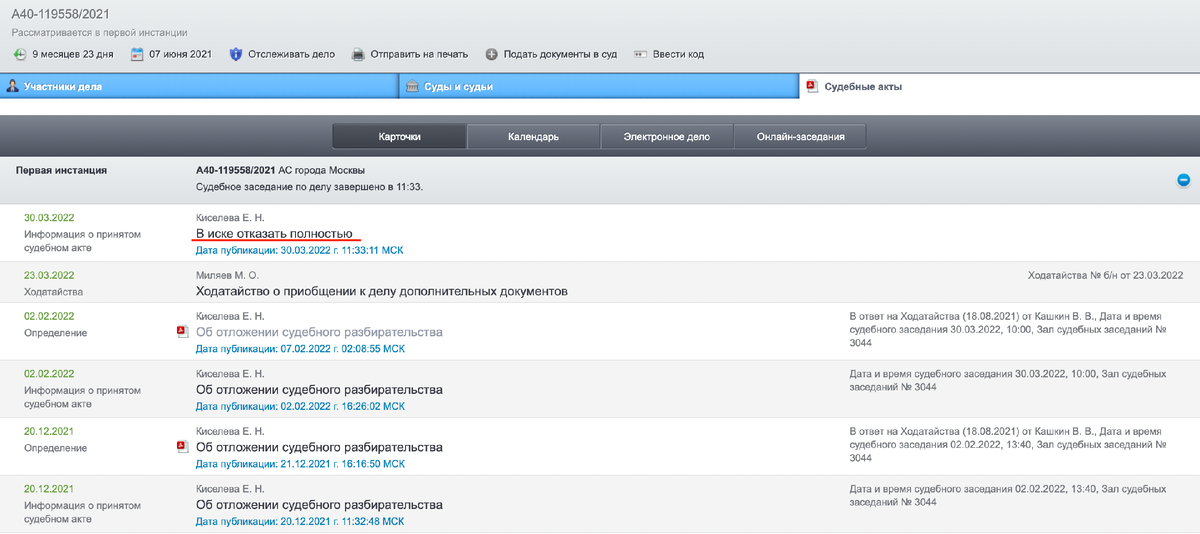 Сегодня, 30 марта 2022 года, Арбитражный суд города Москвы полностью отказал в иске ООО «КОМПАНИЯ ДОРИ»и Михаилу Миляеву к Ассоциации «Честная позиция»и ее генеральному директору Владимиру Кашкину. Спор касался информации, содержащейся в вышедшем чуть больше года назад резонансном расследовании АЧП о контрактном кабеле в торговых сетях. По мнению одного из главных действующих лиц видео – Михаила Миляева в история, рассказанная в видео, не соответствовала действительности и порочила его репутацию. В связи с этим, Миляев в июне 2021 года после тщетных попыток блокировки видео на YouTube подал исковое заявление в суд о защите чести, достоинства и деловой репутации, с просьбой удалить все материалы о расследовании на ресурсах АЧП и выпустить опровержение. Несмотря на заявления данного гражданина, суд, подробно изучив все материалы дела, принял решение отказать в удовлетворении иска в полном объеме. Что вполне предсказуемо в виду того, что приступая к каждому из наших расследований, мы с ос