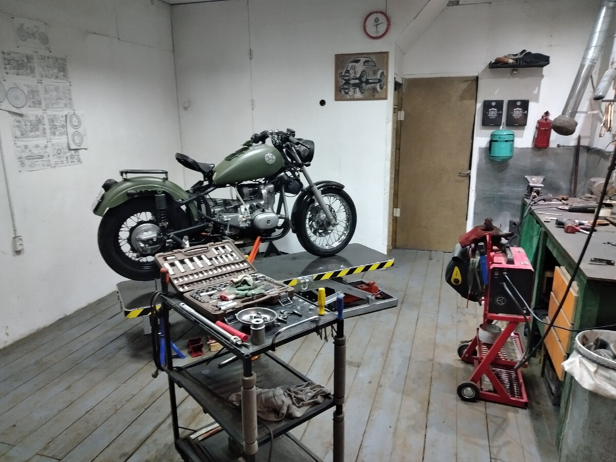 ... Продолжение. После первого сезона у меня появилось желание изменить внешность мотоцикла, к чему я приступил в конце 19 - начале 20 года. Спешить совершенно некуда, список работ не особо обширный, поэтому делалось все "с чувством, с толком, с расстановкой". Мотоцикл загнан на подъемник, частично разобран. В первую очередь, у меня были претензии к передней вилке - в качестве замены нашел оригинальную "Пайоли", от "Урал-СОЛО", на самом деле большая редкость. Подобные вилки ставились и на "Волка", но более длинные, моя же по длине в точности как старая. Кроме того, в комплекте с вилкой было крыло - расчитанное на установку как в стандартные траверсы "урала", так и в более широкую вилку "Волка". Тормоза тоже подобрал новые - суппорт "волчий", перенес крепление на левую сторону. Кронштейн суппорта пришлось изготовить, по посадке он не подходил. Переднее колесо было разобрано, ступицу и обод отдал в пескоструй и порошковую покраску - значительных дефектов они не имели, но в общий вид б