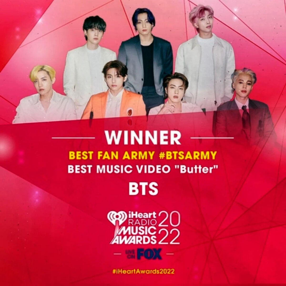 Группа стала победителем в категории «Лучшее музыкальное видео» за их хит «Butter» на церемонии награждения, состоявшейся несколько часов назад в Лос-Анджелесе. Ранее BTS выиграли в категории «Лучшее музыкальное видео» за «Boy With Luv» в 2020 году и «Dynamite» в 2021 году. BTS также получили награду «Лучшая фан-армия», удостоившись чести получить эту награду пятый год подряд в этой категории. Эта награда, присуждаемая лучшему фандому, достаётся фан-клубу BTS «Арми» с 2018 года
