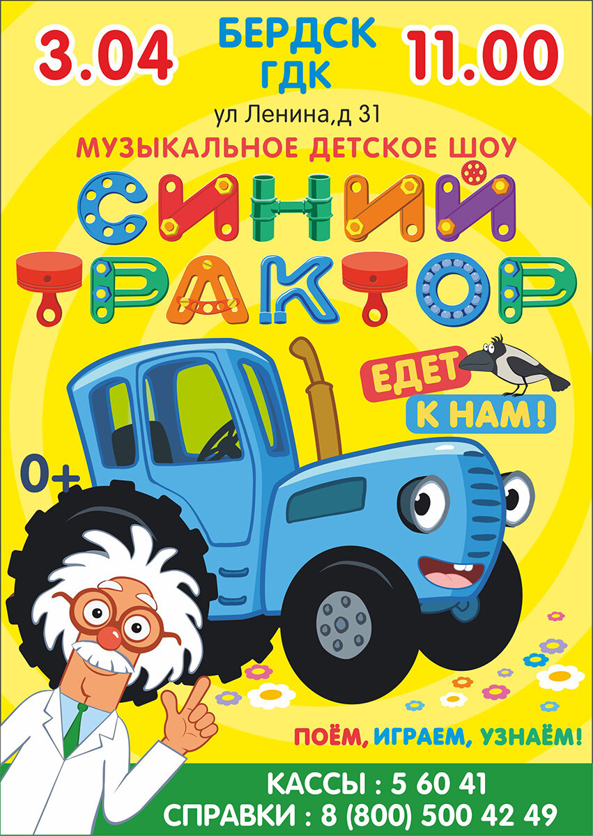 В воскресенье, 3 апреля, в 11:00 в большом зале Городского дома культуры Бердска состоится музыкальное детское шоу «Синий трактор едет к нам!».