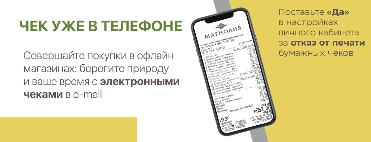 Долгое ожидание на кассе, постоянная чековая бумага в карманах и в сумках. С такими неудобствами сталкивается каждый. Но мы позаботились о вас и решили решить эту проблему. Теперь вы сможете быстро совершать покупку, не ждать печать чека и не хранить лишнюю бумагу, которую всё равно выбросите. А решение проблемы у нас такое – ЭЛЕКТРОННЫЙ ЧЕК. Почему мы «за» электронный чек? На производство тонны печатной бумаги для чеков требуется около 3,5 куб. метров древесины. Много, не правда ли? И это подвергает опасности экологию нашей страны. Факт! Ежедневно магазины печатают километры бумажных чеков, но всего 2-3% людей забирают чек с собой. В 2022 году покупателю легче проверить покупки в телефоне, чем хранить бумажки. Но мы заботимся не только об экологии, но и о вас и сейчас расскажем, почему рекомендуем электронный формат чека: Как отказаться от печати чека и перейти на электронный формат? Вы решили отказаться от чека и не ждать долгой печати? Обязательно! Перед покупкой предъявите кар