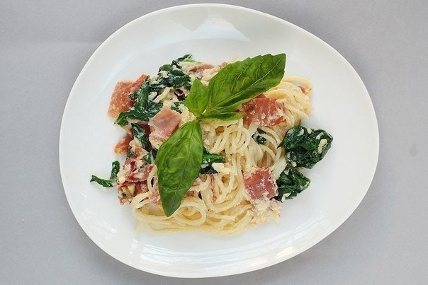 Ингредиенты: Спагетти — 150 г Ветчина прошутто — 60 г Шпинат крупнолистовой свежий — 200 г Яйца куриные — 2 шт. Пармезан — 80 г Рикотта — 60 г Базилик зеленый свежий — 1 пучок Чеснок — 10 г Оливковое масло — 50 мл Соль — по вкусу Черный перец молотый — по вкусу Приготовление: 1. Ветчину прошутто нарежьте полосками шириной 2-3 см, шпинат промойте и крупно нарежьте или порвите на кусочки руками, чеснок мелко порубите. 2. Для приготовления соуса отделите желтки. Разбейте яйцо, перелейте содержимое в ладонь и дайте белку стечь между пальцев. Соедините желтки, рикотту и мелко натертый пармезан, перемешайте. 3. Отварите спагетти в кипящей подсоленной воде в течение 7 минут. Слейте воду, используя дуршлаг, и верните спагетти в кастрюлю. На горячие спагетти выложите сырный соус и быстро перемешайте. Момент, когда желток сворачивается на горячих спагетти, считается ключевым в приготовлении карбонары. 4. Разогрейте оливковое масло на сковороде, обжарьте ветчину по полминуты с каждой стороны