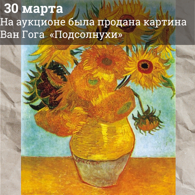● 30 марта 1987 года на аукционе была продана картина Ван Гога Подсолнухи за 50 млн долларов ● Изначально Ван Гог писал эту картину жанра натюрморт для того, чтобы украсить мастерскую своего товарища - художника Поля Гогена, с которым они вместе работали и писали картины. По некоторой версии всего художник писал эту картину 11 раз, то есть была серия работ, посвященных подсолнухам. Их делят на 2 цикла. Первый цикл - парижский, на нём изображены лежащие подсолнухи. Второй цикл созданный в Арле включает в себя работы, на которых художник изобразил цветы в вазе. ● Сама картина имеет довольно примитивный сюжет, совершенно обычная ваза, а в ней подсолнухи. Художнику рисовать цветы, а особенно подсолнухи, в этом Ван Гог признавался в своих письмах. Вероятно это было связанно с тем, что жёлтый цвет был любимым для него.