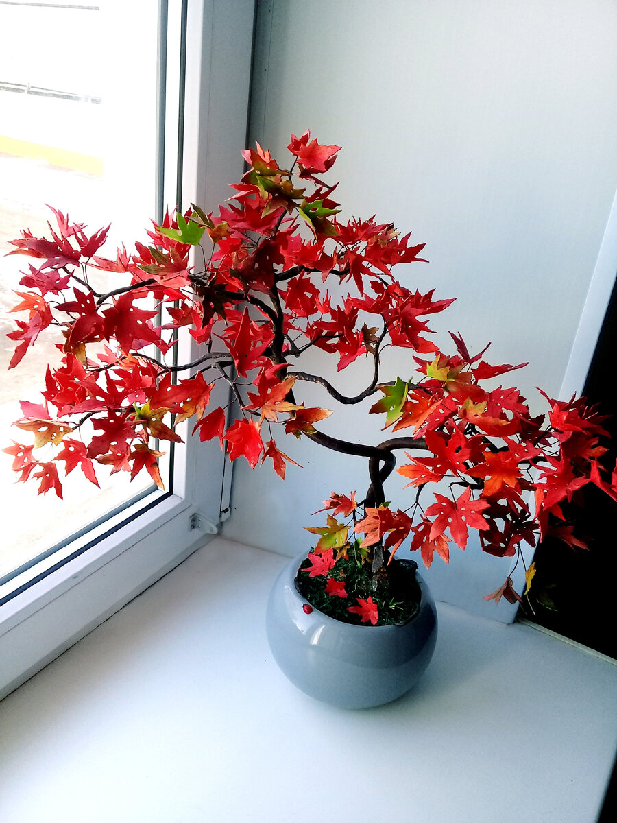 Здравствуйте. В предыдущей статье (ссылка ниже) о японском абрикосе, я писала о своей любви к растениям, в частности, к миниатюрным деревьям. Здесь я хочу показать второе из созданных мной деревьев – клен. Знаете, с годами у нас в городе осень стала редким явлением. Думаю, многие такое замечали: висят зеленые листья, наступает осень, и они просто опадают. Вот так, не успев пожелтеть или, тем более, покраснеть. Одно из самых красивых деревьев осенью, если не самое красивое, на мой взгляд, это клен. Конечно, у нас он желтый, но какое же красивое это дерево и сколько у него видов. Просто посмотрите виды кленов в разных странах, это потрясающе. Но мы немного отвлеклись от темы. Приступаем к процессу создания. В отличие от абрикоса, клен уже создавался как маленький бонсай. Принцип тот же, что и в предыдущий раз. Выбрала горшок, сделала каркас из проволоки. Корни, ствол и ветки обмотала флористической лентой и зафиксировала всю конструкцию гипсом. Полянку у основания дерева я декорировала