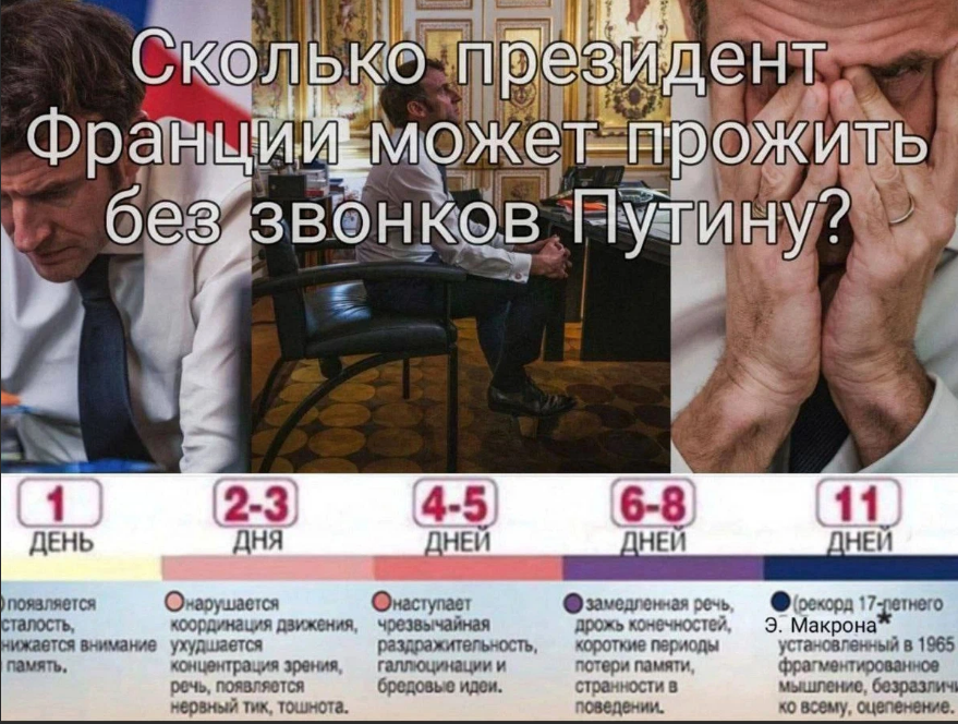 А у Макрона предвыборное турне по стране скоро. И тут уж Путин ему никак помочь не сможет, сколько ни звони.