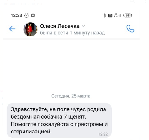 Так всё хорошо начиналось - девушка написала нам, мы обрадовались, что только помочь должны, а не тащить всё на себе. Так как мы ведём отчетность и статистику по обращениям, кураторам, стерилизациям, пристроям, то стараемся оформлять всё по правилам (безусловно придуманным нами, но всё-таки правилам).