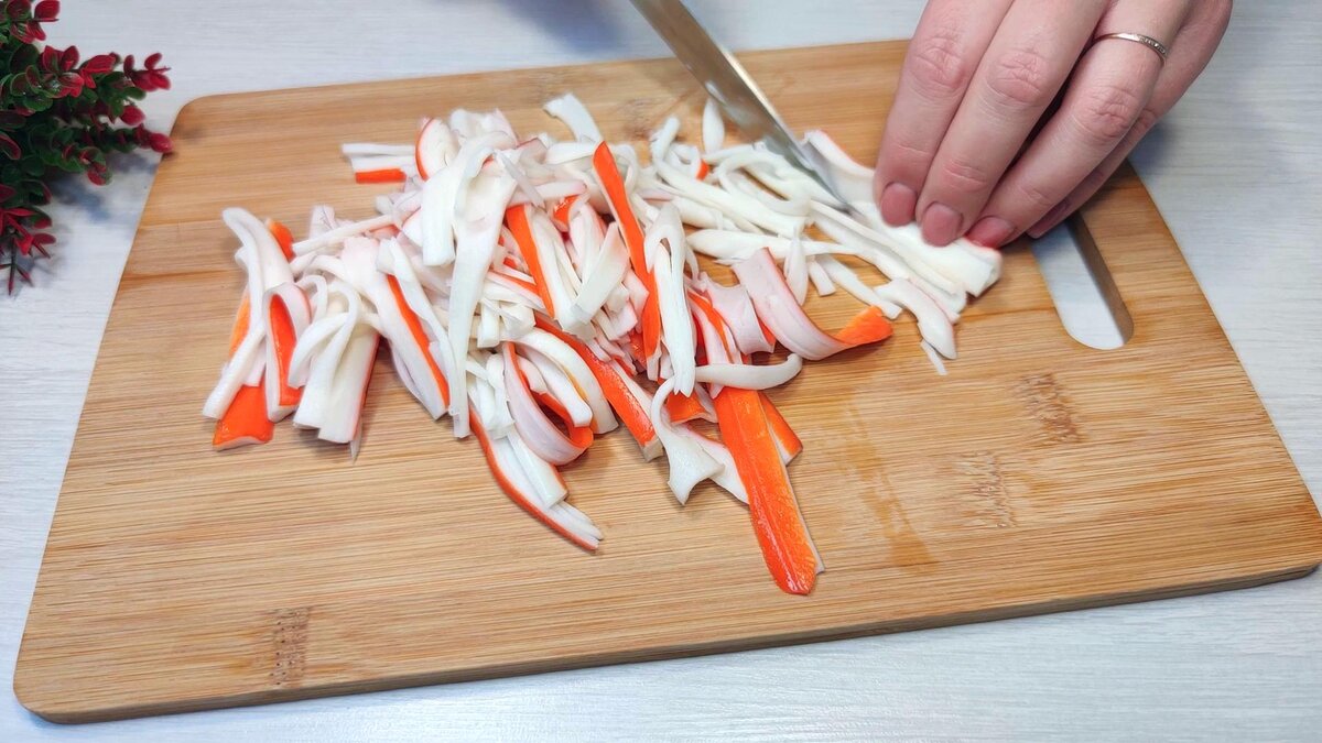 2. Выкладываю в салатник крабовые палочки и затем добавляю лук.