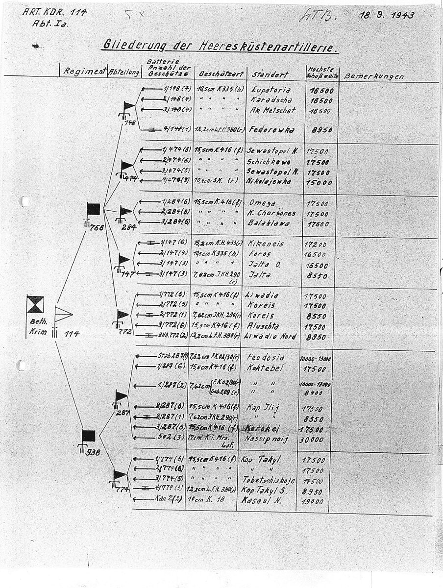 Немецкая береговая армейская артиллерия, подчиненная Главнокомандованию Крымом, в 1943 году замыкалась на 114-ю артиллерийскую комендатуру. Она была представлена двумя полками: 766-м (дивизионы 772, 474, 284, 147, 148) и 938-м. Что о них говорят документы? Есть данные на разные даты, смотрим сентябрь 1943-го.