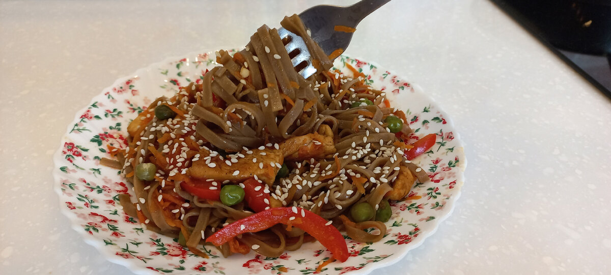 Приступаем к приготовлению Ингредиенты: Куриное филе нарезать на тонкие ломтики Болгарский перец нарезать тонкими полосками Морковь натереть на мелкой тёрке Отварить гречневую лапшу как указано на упаковке После отваривания лапшу следует сразу промыть холодной водой В сковороде разогреть Оливковое масло Добавить курицу и чеснок К курице Добавить Морковь, перец, и горошек После, добавить Соевый соус и тушить пару минут К готовой гречневой лапше Добавить курицу с овощами Наше блюдо готово Приятного аппетита!