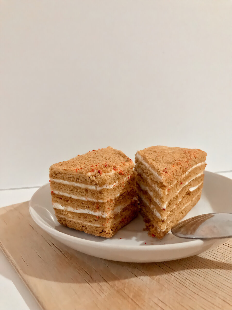 Тесто: 2 яйца, 150г сахара, 120г мёда, 85г сливочного масла, 1ч.л соды, 350г муки. Крем: 500г сметаны, 110г сахара, 90г сливочного масла. Нежнейший сметанный крем для медовика готов! Отправляем в холодильник на пару часов. Приятного аппетита!
