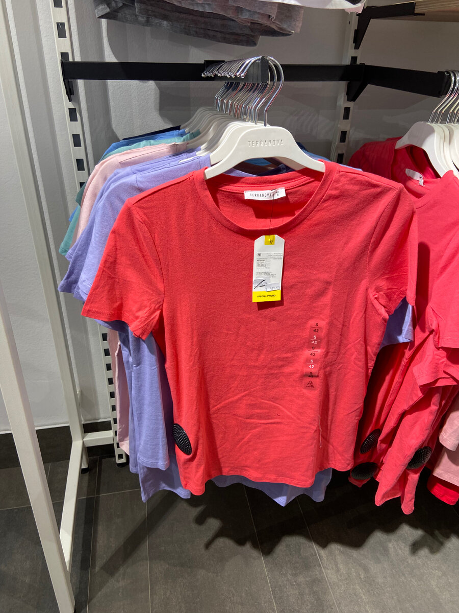 На футболке розового цвета мы отчётливо видим, что рукава у неё узкие и какие то куцые. Такая футболка никогда не будет смотреться стильно.