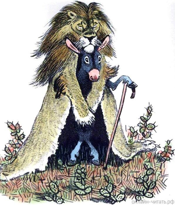 Классическая басня Жана де Лафонтена о важности принятия себя и оценки того, кто мы есть. Осел рассеянно бродил по лесу, и вдруг наткнулся на львиную шкуру. После первоначального испуга он подошел к ней и решил надеть. Он думал, что если он переоденется во Льва, все животные будут бояться его. Он надел шкуру и вышел, чтобы показать себя перед другими животными. Все, увидев его, убежали в отчаянии, думая, что это, действительно, Лев, который пришел, чтобы напасть на них. Ослик обрадовался своему новому облику. Но, к его неудаче, во время прогулки он встретил крестьянина. Тот испугался, увидев предполагаемого льва. Но он понял, что что-то странное, потом увидел, как высунулись длинные уши осла, и побежал снимать с него шкуру. Убедившись, что это маскировка, он начал избивать осла, в качестве наказания за испуг, что заставил его бояться. Мораль: Никогда не притворяйтесь кем-то, кем вы на самом деле не являетесь.