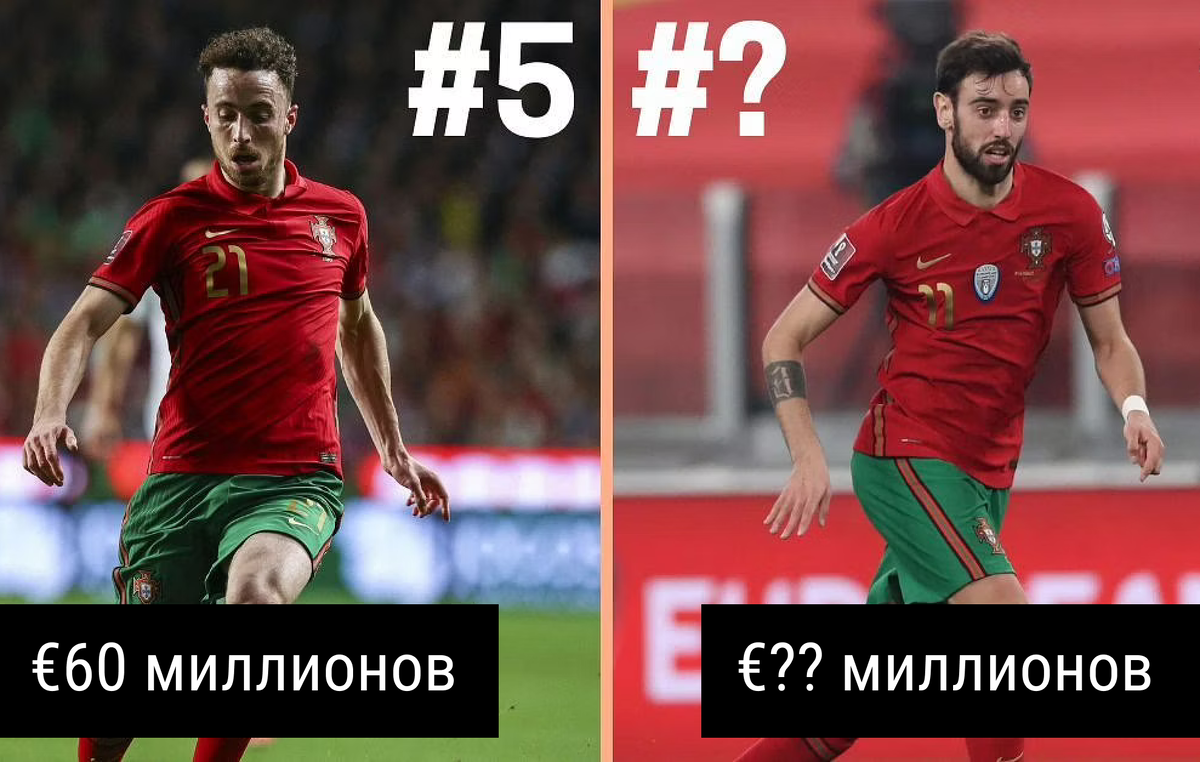Бруну Фернандеш - самый ценный португальский игрок с ценником в 90 миллионов евро. Фернандеш впервые попал в поле зрения в "Спортинге", забив 63 гола и отдав 52 результативные передачи в 137 матчах во всех соревнованиях. "Манчестер Юнайтед" купил его в 2020 году за 63 миллиона евро.