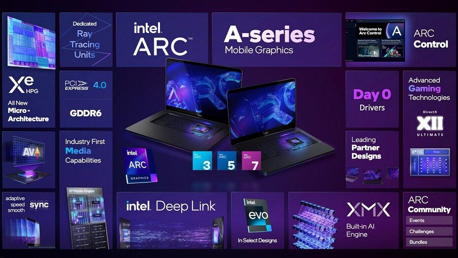Всего было презентовано пять моделей дискретных видеокарт: Intel ARC A350M, A370M, A550M, A730M и A770M. Американская компания Intel наконец официально представила линейку мобильных видеокарт ARC A-Series, в которую вошло пять моделей дискретных ускорителей: Intel ARC A350M, A370M, A550M, A730M и A770M. Intel ARC A350M получила 96 исполнительных блоков и 768 графических ядер, работающих на тактовой частоте 1150 МГц, дополненных 4 Гбайт видеопамяти GDDR6 с шиной 64 бит. Intel ARC A370M: 128 исполнительных блоков и 1024 графических ядра с частотой 1550 МГц, те же 4 Гбайт видеопамяти. Intel ARC A550M: 256 исполнительных блоков и 2048 шейдерных процессоров с частотой 900 МГц, 8 Гбайт видеопамяти с шиной 128 бит. Intel ARC A730M: 384 исполнительных блоков и 3072 графических ядра с частотой 1100 МГц, 12 Гбайт памяти с шиной 192 бит. Intel ARC A770M: 512 исполнительных блоков и 4096 шейдерных ядер с частотой 1650 МГц, 16 Гбайт памяти с шиной 256 бит. Ноутбуки с видеокартами Intel ARC 3 уже по