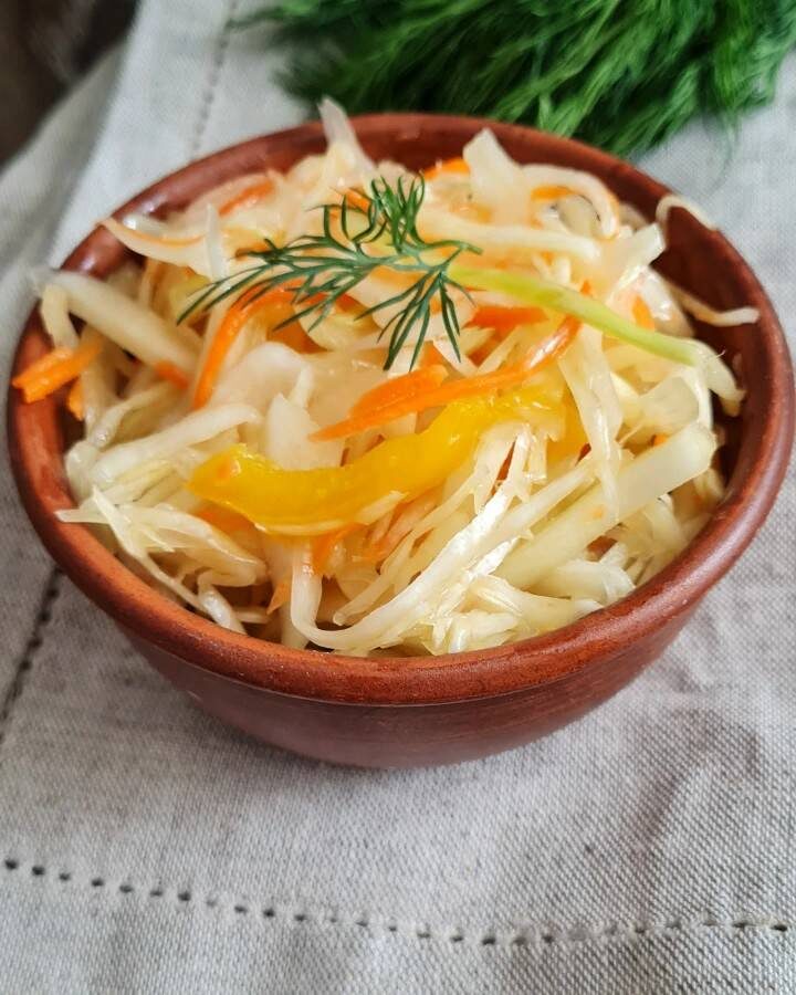Весна - период, когда ещё свежих овощей нет, только пластиковые помидоры и тепличные огурцы, поэтому спасаемся сезонными овощами. У меня для Вас рецепт быстрой маринованной капусты. С картошечкой и селёдочкой на ужин, с яичницей - на завтрак. Готовьте, очень вкусно и быстро! Ингредиенты: Капуста белокочанная , Морковь (небольшая), Перец болгарский , Лук репчатый , Рассол: Уксус , Вода , Масло растительное , Соль , Сахар Способ приготовления: Капусту нашинковать и сложить в большую миску. Морковь натереть на крупной тёрке или на тёрке для моркови по-корейски. Лук разрезать на 4 части и нарезать полукольцами. Болгарский перец нарезать полосками. Все нарезанные овощи сложить в миску к капусте и аккуратно перемешать. Для рассола в сотейник насыпать сахар, соль, влить уксус, воду и масло. Довести до кипения, постоянно помешивая, чтобы растворился сахар и соль, и убрать с огня. Не кипятить! Горячим маринадом залить капусту с овощами и дать постоять 30 минут. Затем аккуратно перемешать и разл