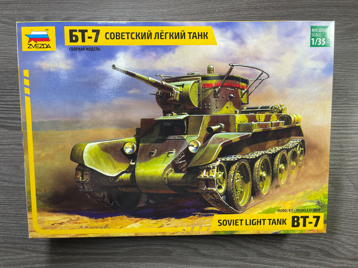 Друзья всем привет! Сегодня на обзоре еще старичок от Звезды - легкий танк БТ-7. Краткая справка БТ-7 - советский колёсно-гусеничный танк периода 1930-1940-х годов. Третий танк семейства советских лёгких танков БТ («Быстроходный танк»). В отличие от своих предшественников БТ-2 и БТ-5, имел сварной корпус несколько изменённой формы и новый двигатель. Вооружение аналогично БТ-5. Выпускался, как и БТ-5, в варианте с радиостанцией и без радиостанции. История создания В январе 1933 года, когда осуществлялась работа над конструкторской документацией танка БТ-5, танковое конструкторское бюро («отдел 520») Харьковского завода получило задание на разработку нового танка, в котором предполагалось устранить недостатки предшественников. По документации, предполагалось установить двигатель М-17 (более надёжный, чем М-5), сварной корпус с улучшенной обзорностью для механика-водителя, увеличить ёмкость топливных баков и установить башню с 76-мм пушкой. То есть предполагалось создать «ударный колёсно-