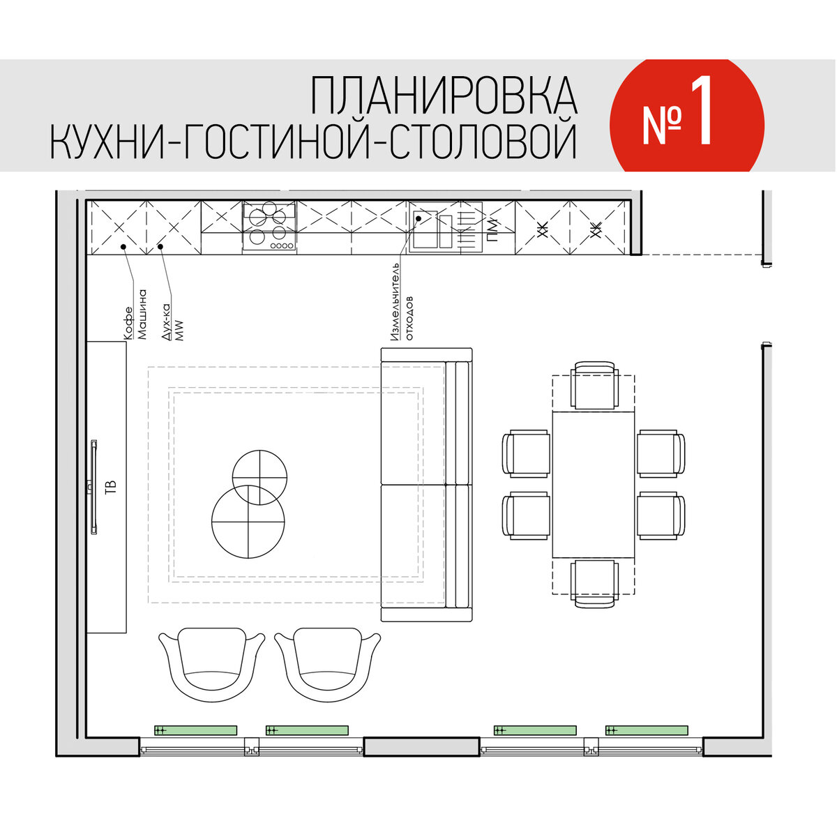 Планировочные решения кухни-гостиной в нашем проекте квартиры в ЖК Русский Дом. Во время создания дизайн-проекта будущего интерьера мы всегда предлагаем несколько решений планировки. При создании решений ориентируемся на техническое задание от заказчика, но часто предлагаем и свои варианты. В наших видео про создание дизайн-проектов мы показываем некоторые несогласованные планировки и рассказываем, почему вносились изменения. А сегодня хотим спросить у вас - какое решение выбрали бы вы и почему? 1. В первом варианте мы предложили разместить кухню в линию, в зоне гостиной поставили диван и два кресла, а в зоне столовой раскладной обеденный стол. 2. Заказчики захотели разместить барную стойку. Для этого мы поменяли компоновку планировочного решения, перенесли проём в левую часть, сохранив размеры кухни. Но пришлось уменьшить зону гостиной. 3. В финальном согласованном варианте вы видите кухню в современном исполнении. Также мы нашли стол со столешницей из камня. Благодаря очень простой