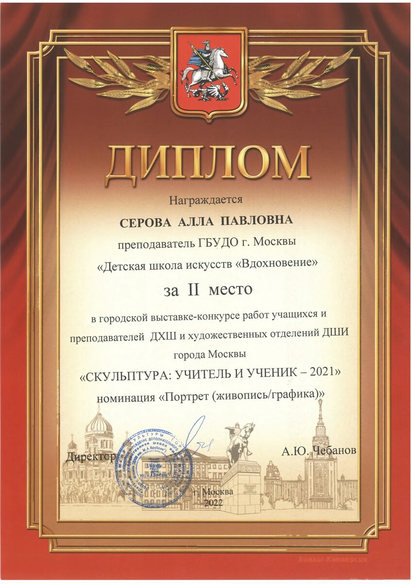 Мы уже писали о Городской выставке-конкурсе работ учащихся и преподавателей ДХШ и художественных отделений ДШИ города Москвы “Скульптура: учитель и ученик-2021”, которую проводит ГБУДО города Москвы “Детская художественная школа имени М.А. Врубеля”! Подведены итоги во всех номинациях и мы представляем Вашему вниманию всех победителей - воспитанников и преподавателей ДШИ "Вдохновение"! Вы уже знаете, что Денисова Василиса (преп. Смышляева Е.А.) и ее конкурсная работа "Балерина" заняли III место в номинации "Скульптурная композиция (рельеф)! Но это еще не все достижения нашей талантливой воспитанницы и ее преподавателя! Василиса также награждена дипломом за III место в номинации "Скульптурная композиция" за работу «Портрет Грозного»! Преподаватели нашей школы также активно приняли участие в конкурсных просмотрах. Поздравляем: Серову Аллу Павловну - II место в номинации "Портрет живопись/графика" (конкурсная работа «Валюшка», акварель)! Смышляеву Екатерину Александровну - II место
