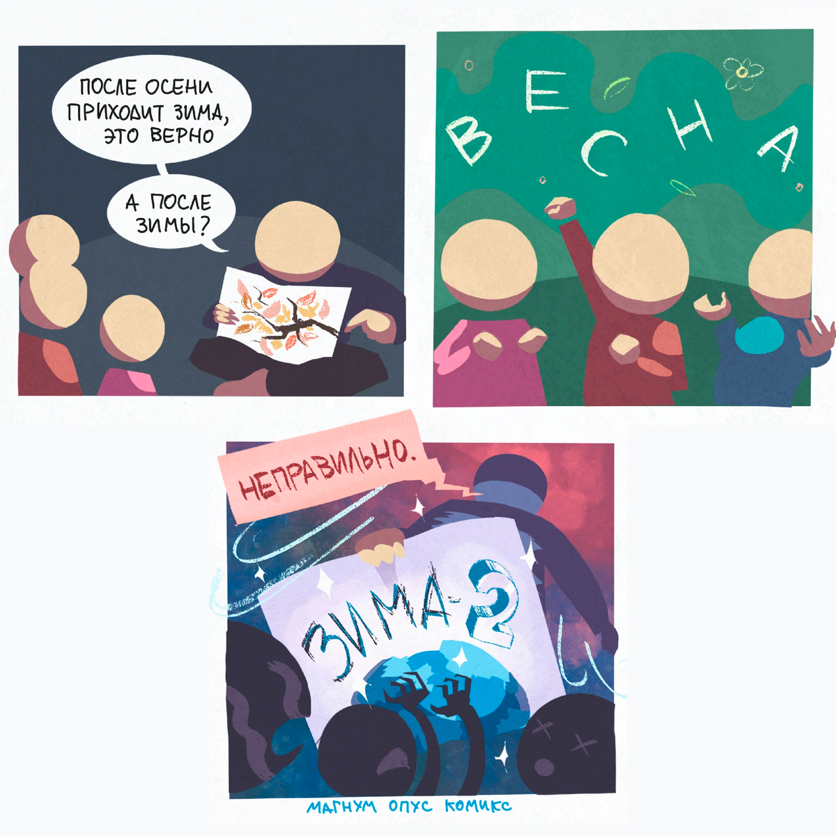 На дворе уже второй месяц весны и, людям, конечно, уже давно хочется солнца и тепла, но погода зачастую с этим не торопится. Зима в северных широтах всегда длиннее своего календарного отрезка, а значит снег может никуда не деваться ни в марте, ни в апреле (хотя, само собой, этого очень хочется). И сегодня я решил собрать подборку комиксов на тему того, что весна никак не хочет наступать, а зима не спешит уходить. Как не сложно догадаться, авторы в этом материале будут в основном российские - все-таки многим жителям нашей страны уж точно известно, что такое долгая весна. Будем надеяться, что он наступит уже скоро. Волгоградский художник Даниил Казакевич является автором серии комиксов магнум опус. Данный проект представляет из себя юмористические веб-стрипы на самые разные темы, но большинство из них - это какие-либо жизненные ситуации, доведенные до абсурда. Еще одна отличительная особенность серии магнум опус - это тот факт, что у персонажей чаще всего нет лиц. Что впрочем, совсем не