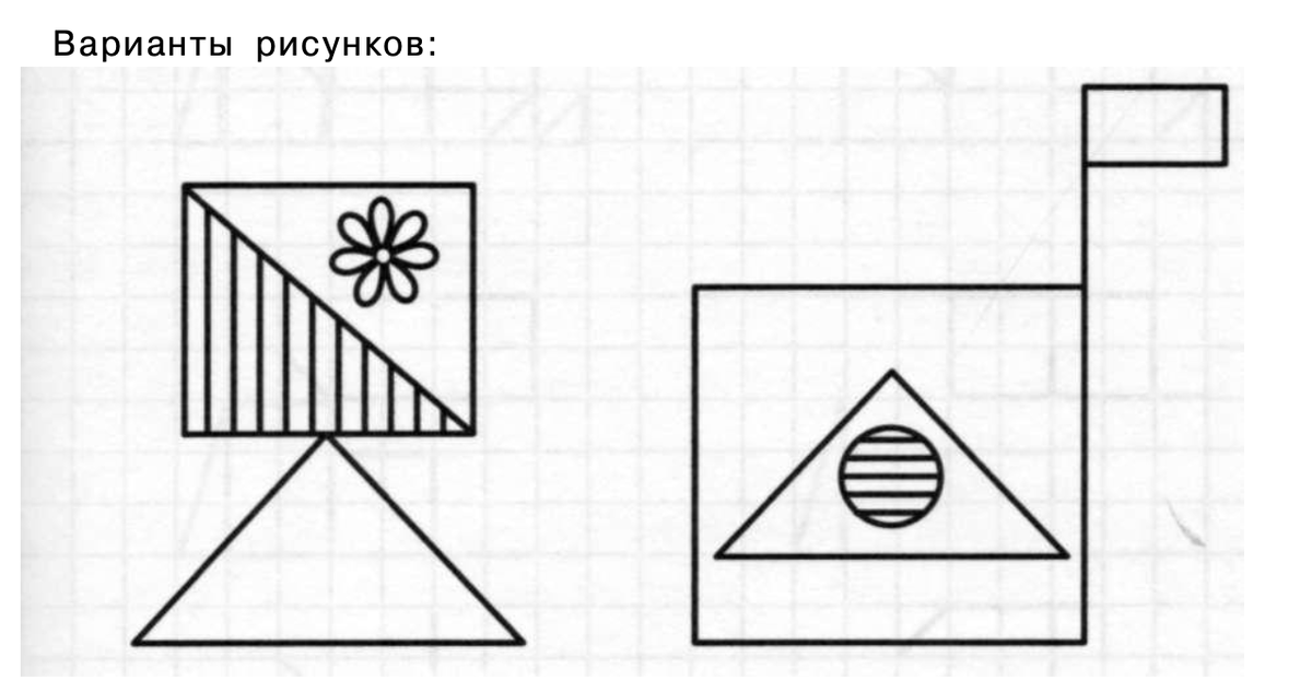Сначала ребёнок рисует, руководствуясь инструкцией взрослого. Образец рисунка ребёнка не должен видеть. Варианты рисунков могут быть любыми, в зависимости от возраста ребёнка. Задел взрослый и ребёнок меняются ролями. Ребёнок придумывает рисунок и даёт инструкцию взрослому. Взрослый рисует по инструкции ребёнка. Пример объяснения для второго рисунка. Нарисуй квадрат. Внутри квадрата нарисуй равнобедренный треугольник. Внутри треугольника нарисуй круг и заштрихуй его. Штриховка должна быть горизонтальной. От правого верхнего угла квадрата проведи вверх линию длиной 1,5 см. Далее 1 см вправо, о,5 см вниз, 1 см влево. Подпишись, чтобы нас не потерять!