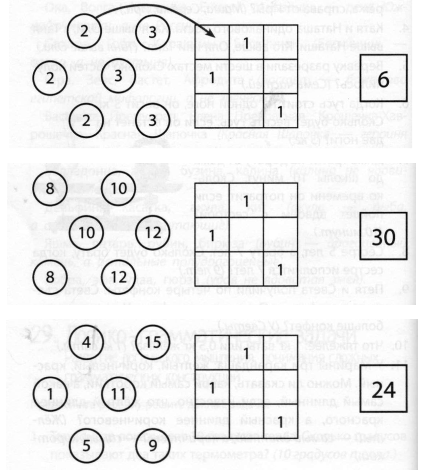 Ребёнок должен расставить данные числа в пустые клетки квадрата так, чтобы по горизонтали и по вертикали в сумме они давали заявленное число.