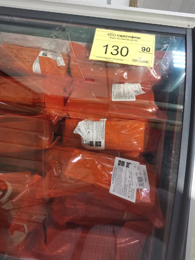 Довелось мне увидеть некоторые новинки, коих я ранее не наблюдала в ассортименте "Светофора", а потому и обзор будет именно на эту тему. Многие столкнулись сейчас с довольно ощутимым повышением цен, но могу сказать, что и подобных эконом-магазинов это коснулось - не то, чтобы сильно, но я вижу, что некоторые цены все же поменялись. Благо что не все. Но говорить будем не об этом, а о более приятных новостях: в магазине появились самые разные новинки, которые и стоят недорого, и внимание к себе притягивают. Немного расстроило, что часть полок была абсолютно пустой, хотя ранее я еще с таким не сталкивалась, но спрос на продукты сейчас сильно вырос, это видно и по другим магазинам. Собственно, первая же находка, с которой мы и начнем сегодняшнее обсуждение: Так меня обрадовало, что появился фарш из минтая. Давно уж не находила его в принципе, хотя когда-то мы хотя бы раз в недельку жарили из него котлеты. Если правильно подобрать специи, то получается очень вкусно, однако многое зависит и