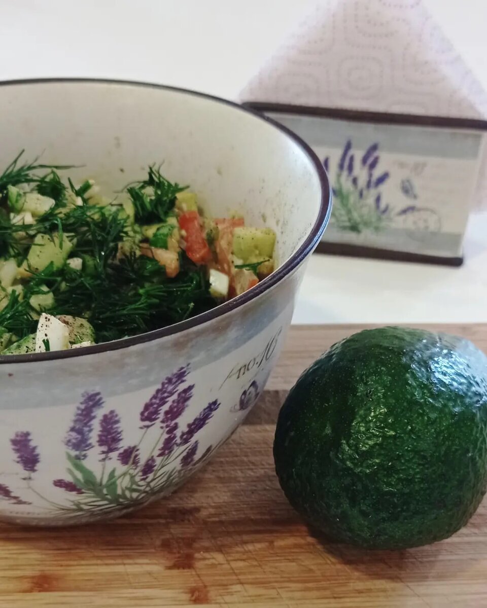 Добрый день! Салатик готовила вчера, Салатик с авокадо Нам понадобится: 🥒1 огурец свежий 🍅1 помидор 🥑1 авокадо 🥚🥚22 яйца варёных 🧅Лук зелёный или репчатый Укроп Итальянские травы Оливковое или подсолнечное масло 2ст.ложки сока лимона Соль и перец по вкусу. Разрезать авокадо вокруг плода до косточки и повернуть две половинки, косточки вынуть и можно посадить в воду, пока косточка не даст росток и треснет. Как подрастёт, можно пересадить в грунт. Авокадо вынуть ложкой и нарезать на кубики, также помидор, огурец и яйца. Сложить в салатник, добавить итальянские травы, лук, я нарезала зелёный, туда же укроп. Посолить и поперчить, можно смесью белого и чёрного перцев, заправить маслом и лимонным соком. При желании можно добавить кунжут или кедровые орешки. Можно салат разложить в лодочки(кожура авокадо). #готовимдома#кулинариямаринина#вкуснодома#прованс#посудапрованс#предметноефото#кул нарноефото#простаяеда#готовимбыстро#салатиксавокадо#авокадо#салатназавтрак