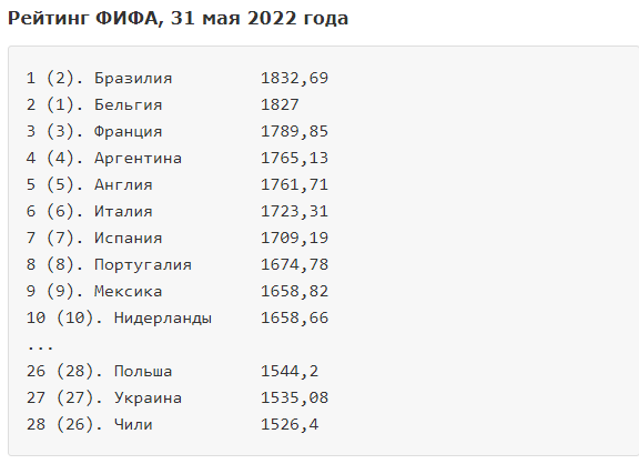 Сборная Бразилии вышла на первое место в рейтинге Международной федерации футбольных ассоциаций (ФИФА). Бразильцы обошли сборную Бельгии, которая находилась на вершине рейтинга последние 3,5 года. Украина, не проводившая матчей в связи с военной агрессией России, осталась на 27-м месте.