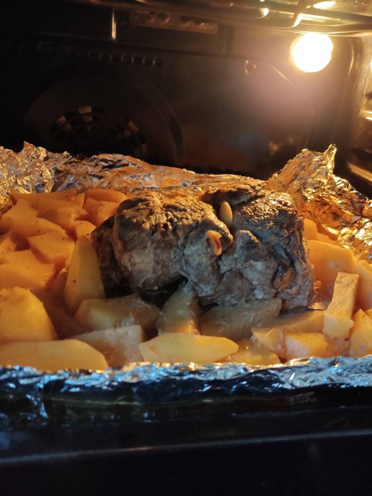 Самое главное в рецепте - мясо должно быть парным, т е не мороженным. Подойдёт любой хороший кусок мякоти кг 1.5-2, без костей и сухожилий. Ингредиенты: Мясо, Чеснок, Соль, перец, прованские травы, Горчица, Сметана, Картофель Способ приготовления: Мясо помыть, обсушить бумажными полотенцами. Натереть солью, перцем, приправами. Сделать надрезы, вложить в них зубчики чеснока. Обмазать горчицей, потом сметаной и оставить мариноваться. Если есть время то замариновать с утра и убрать в холодильник до момента приготовления. Если нет времени хотя бы на пару часов оставить под крышкой на кухонном столе. Почистить и крупно нарезать картофель. Замариновать как вам нравится - у меня кетчуп, сметана, приправы. Противень застелить фольгой. В центр выложить мясо, вокруг картофель. Накрыть фольгой и плотно завернуть ее со всех сторон. В разогретую до 180-200 духовку поставить противень и запекать 1.5 часа. Затем снять верхний слой фольги и дать подрумяниться ещё 20-30 минут. Приятного аппетита! Но по