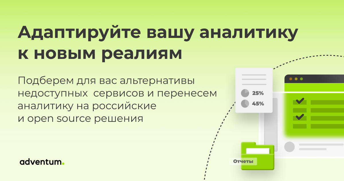 Изменения, особенно такие серьезные и внезапные — это испытание для бизнеса в России. Чтобы сейчас сохранить продажи и в целом бизнес, важно сформировать надежную аналитику. Digital-агентство Adventum анонсировало новую услугу по защите аналитики от санкций. Эксперты в короткие сроки подберут и внедрят аналитическое решение на российских и open source инструментах. Такое решение не коснутся санкции, а значит данные для анализа маркетинга и поиска точек роста будут в безопасности. Во многих сферах сейчас время трансформации. Так и в маркетинге приходится осваивать новые каналы продвижения и конкурировать в новых условиях. Поэтому как никогда важно быстро принимать взвешенные решения, желательно на основе данных. И без надежной аналитики здесь никуда. Но и с ней все непросто. Популярные визуализаторы (Tableau, Power BI) уже ушли из России. Из-за сложностей с оплатой в зоне риска оказались продукты Google. Чтобы помочь компаниям обезопасить их аналитическую инфраструктуру, digital-агентст