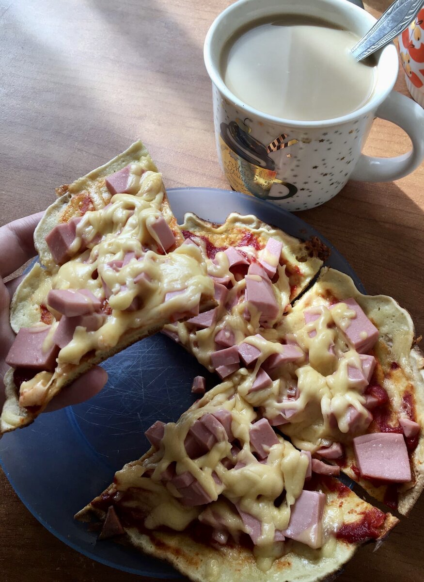 Для теста: Для начинки подойдёт всё, что осталось в холодильнике. Главное, подходящее для пиццы. Все ингредиенты смешать вилкой, должна получится консистенция, как для оладьев, или немного гуще. Выливаем тесто на сковороду, разравнивая ложкой, жарим на медленном огне, чтобы не было сырого теста, потом выкладываем начинку. Накрыть крышкой и готовить ещё минут 5 на медленном огне. Быстрый завтрак или перекус готов. Приятного аппетита😋