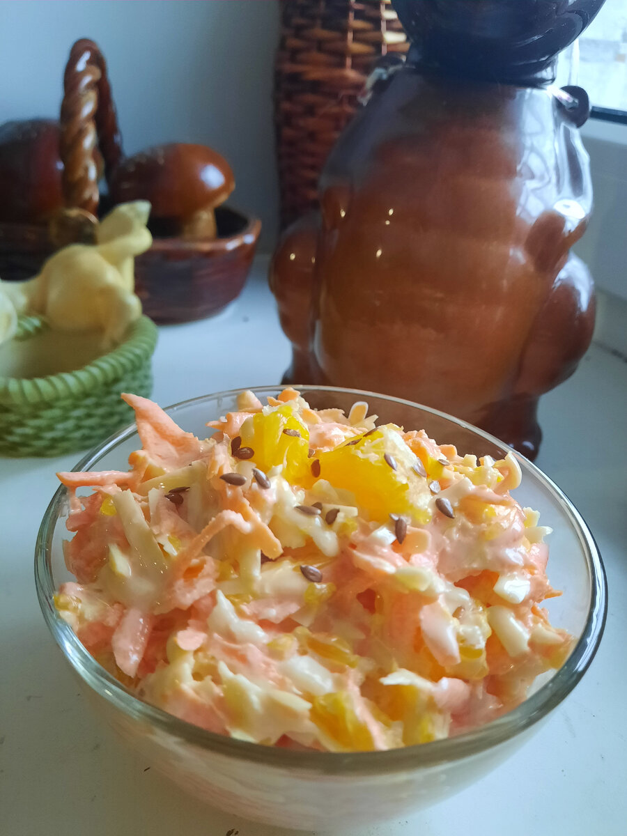Еще один салат из разряда " проще простого" Нам понадобится: Морковь средних размеров - 2 шт Сыр - 80 гр Апельсин - 1 шт Чеснок - 1-2 зубчика Майонез Начинаем готовить: Морковь моем,чистим и натираем на крупной терке. Сыр так же натираем на крупной терке. Чеснок натираем на мелкой терке. Апельсин моем,чистим,снимаем пленку с долек оставляя мякоть. Морковь,сыр,чеснок и апельсин смешиваем в салатнике с майонезом. Получается очень вкусный салат ,который просто готовить и вкусно есть😋! Приятного аппетита!