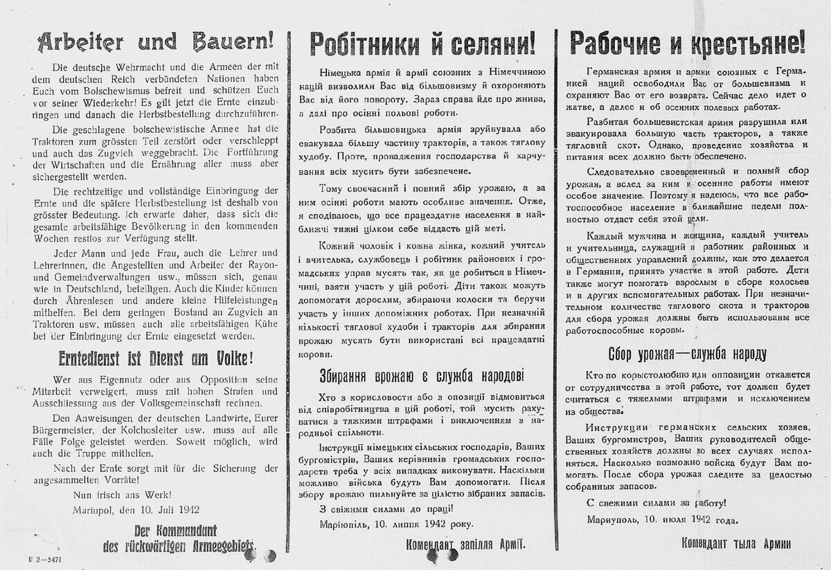 Да, интересная картинка получается, когда только-только оккупированные территории, сразу начинают работать на оккупантов. Мы лишь чуть-чуть коснулись работы отделов Wi при штабе групп армий. Давайте посмотрим чуть подробнее. На самом деле противник поработал в этом направлении изрядно. не поверите, но "гансы" даже верстали бюджет каждого района, и, умудрялись сделать так, чтобы бюджет и был выполнен, и вся "социалка"восстанавливалась, и Фатерлянду оставалось. Казалось бы, рай земной, школы восстанавливаются. библиотеки всякие, но токмо чудес не бывает. Как там говорил управдом Бунша: "За чей счет банкет?!" Дык, все просто: за колхозный. Фиг вам товарищи, а не вольный труд на своей земле (посмотрите доходную часть бюджета, пункты е) и f)? и все станет ясно), набрали штрафов с населения, и, вуаля, на "муниципальную полицию" хватает (и не только). А, полиция опять-таки непростая... Была (до мая) милиция, стала (с июня) вспомогательная полиция. И не простая, а... украинская. "При