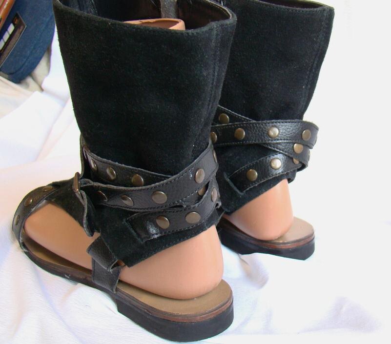 - Римские сандалии или гладиаторы — это модель, которая довольна похожа с греческими босоножками. Но их главное отличие в том, что они более высокие. А потому с их помощью удается создавать действительно интересные и необычные образы с платьями и юбками.