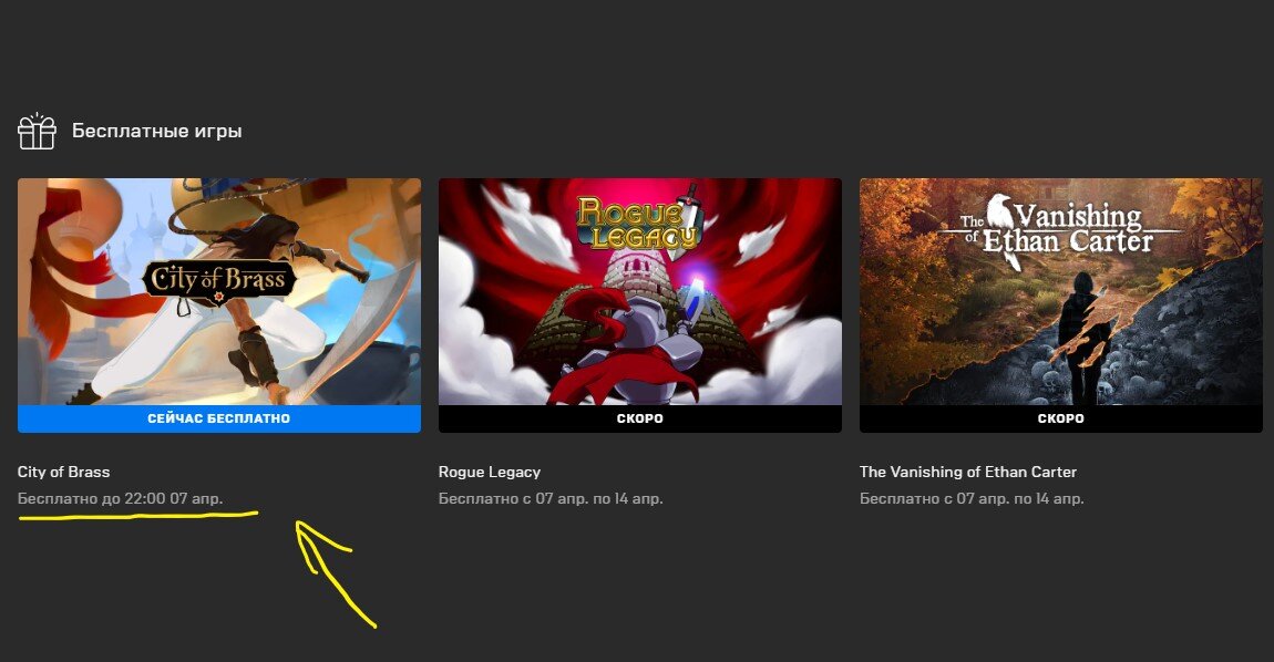 С 31 марта по 7 апреля 2022-го года добавь БЕСПЛАТНУЮ игру от EPIC GAMES "City of Brass" с видом от первого лица, как в Dying Light. В Steam она стоит 435 российских рублей! В игре нужно пробраться в центр арабского города, размахивая саблей и хлыстом. Минимальные требования для "City of Brass": Система: Windows 7 (64-разрядная) Процессор: Двухъядерный с частотой не менее 2,4 ГГц Память: 4 ГБ Место на диске: 4 Гб Видеокарта: GeForce GTX 550 или похожая Озвучка: Нет Текст: Русский С 7 апреля 2022г. готовься забрать две игры: пиксельная 2Д "Rogue Legacy" и детективную игру от первого лица "The Vanishing of Ethan Carter"! Забрать игру тут 👉 https://store.epicgames.com/ru/p/city-of-brass
