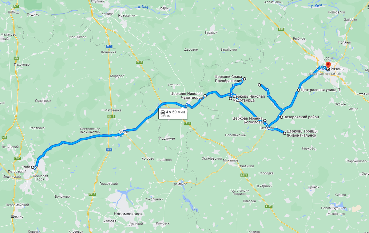 Маршрут: Тула – Осово - Окуньково – Мотовилово – Токарево – Субботино – Добрые Пчёлы – Спасские Выселки - Байдики -Елино -Старое Зимино - Стенькино - Рязань