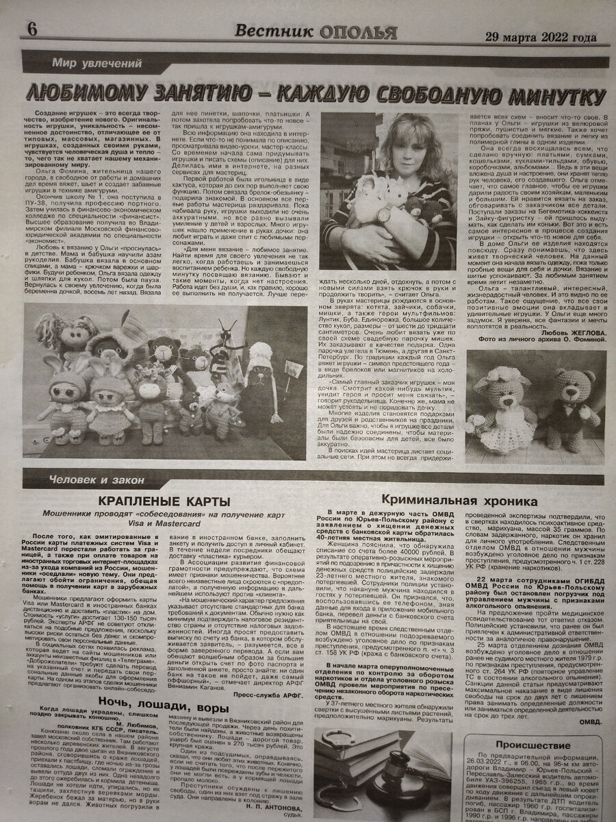 Совсем недавно мне написала сообщение ВКонтакте журналист нашей местной газеты "Вестник Ополья" с предложением написать статью про моё рукоделие, мои игрушки. Я долго думала, а надо ли мне это? Но потом все же согласилась. Ответила на её вопросы, прислала несколько общих фотографий моих работ, несколько фотографий меня с моими работами... И вот во вторник 29 марта статью про меня напечатали