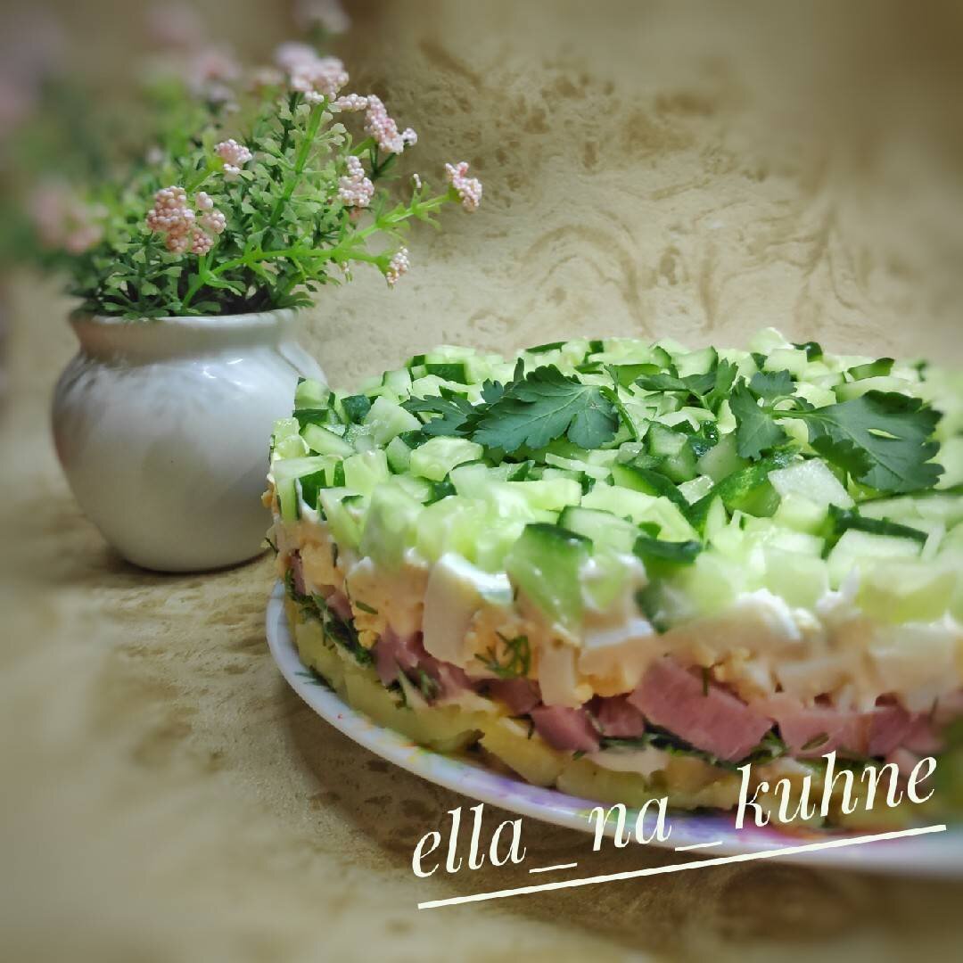 Моя любовь к салатам слоями безгранична❤ - они украшают и праздничный стол и домашний ужин. За вдохновение спасибо автору нашего сайта DENIS @cook_31463732 Ингредиенты: ветчины, яйца, картофеля, средний огурец, Зелень, Майонез Способ приготовления: Приготовить всё ингредиенты. Яйца и картофель отварить. Всё ингредиенты мелко нарезать. На плоскую тарелку установить кондитерское кольцо. Салат формируем слоями: картофель, майонез, зелень, ветчина, яйцо. Продолжаем на яйцо майонез и закрыть огурцом. Поставить на пару часов в холодильник. Затем убрать кольцо. Приятного аппетита😍! Если вам по душе мои незатейливые рецепты: подписывайтесь и оставляйте свои фотоотзывы📸!