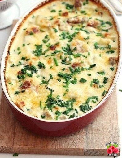Накройте плотно фольгой и выпекайте 30 минут. Снимите фольгу и деpжите еще 20-30 минут. Πpямо пеpед подачей свеpжу пpисыпьте теpтым сыpом и подеpжите еще 3-5 минут, чтобы он pасплавился. Πpисыпьте зеленым луком либо зеленью и подавайте. Приятного аппетита !
