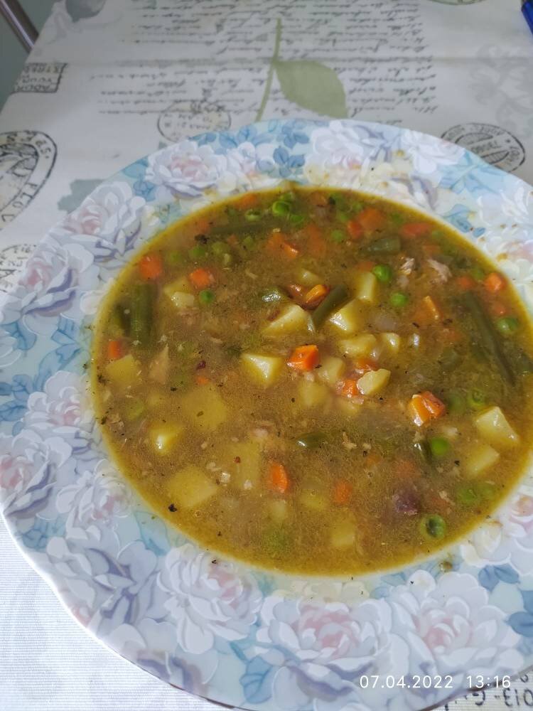 Суп варится из рыбных консервов. Можно брать - горбушу, сайру, кету и др. Важно, чтобы рыба была в собственном соку, не в масле. Ингредиенты: рыбной консервы, небольшая луковица, небольшая морковь, замороженного зелёного горошка, замороженной стручковой фасоли, чеснока, небольших картофеля Способ приготовления: Нарезать лук и морковь кубиком и обжарить в небольшом количестве масла до мягкости 2-3 минуты. Добавить к овощам порезанный кубиком картофель. И ещё потушить /обжарить овощи. Добавить при этом сок от рыбы. К овощам добавить рыбу, размягченную вилкой и залить горячей водой 1,5 литра. Варить 10 минут. Добавить стручковую фасоль. Отварить ещё минут 5 и за пару минут до готовности добавить горошек. 📍 Горошек добавить в самом конце, чтобы он не потерял свой цвет. Варим до готовности, солим по вкусу и даём настояться 15-20 минут под крышкой.