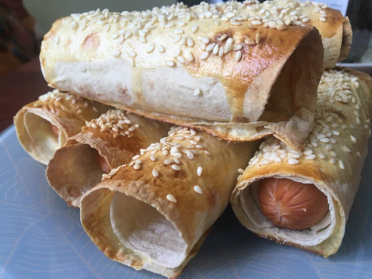 Всегда бывают ситуации когда нужен быстрый перекус или вечерняя трапеза без заморочек.Берем сосиски и лаваш и получаем Магию! Абсолютно ничего сложного! Итак поехали! Берём лаваш(лучше тандырный),сыр пластиками по вкусу(нарезанные проще свернуть),сосиски по вкусу,одно яйцо и кунжут. 1.Нарезаем лаваш в размер сосиски.Яйцо взбиваем венчиком для смазки. 2.Кладем сыр на лаваш ,а сверху сосиску и сворачиваем трубочки.Обматываем один раз и оставляем кромку для смазки яйцом и последующей склейки полученной трубочки. 3.Укладываем на противень.Смазываем сосиски яйцом и посыпаем кунжутом.