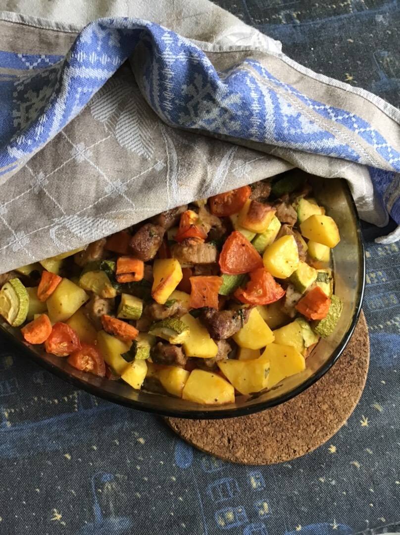 Ингредиенты: бедро индейки, моркови, средних помидора, кабачок, средних картошки, шампиньонов, растительного масла, соль , перец , паприки, прованских трав