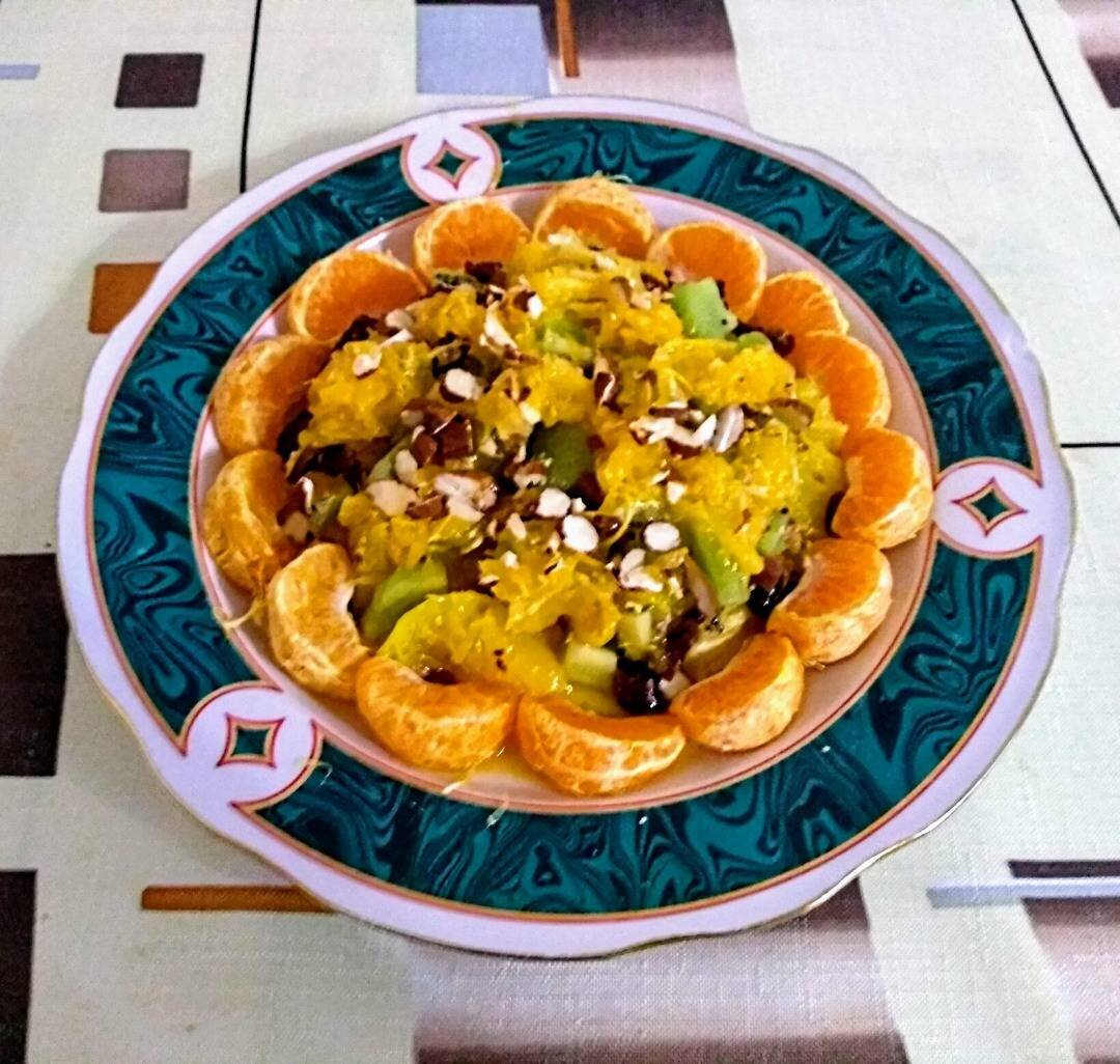 #пост Вкусный, простой и витаминный салат. Аппетитная смесь ароматов, буйство вкуса свежих фруктов сделают этот простой фруктовый салат прекрасным дополнением дня. Спасибо большое за вдохновение автору Ирине Мысиной. @mysina_irina Ингредиенты: Апельсин, Мандарины, Киви, Финики, Миндаль (или миндальные лепестки) Способ приготовления: Фрукты вымыть, обсушить. Апельсин очистить от кожуры, разделить на дольки и очистить от перегородки. Порезать крупными кусочками, сразу выложить на блюдо. Финики разрезать пополам, извлечь косточку и порезать их на 2 части. Выложить на апельсин. Киви очистить от кожуры, порезать кубиками и выложить на финики. Миндаль обжарить и порезать плоскими ломтиками и половину выложить на салат. Один мандарин очистить от кожуры и косточек и измельчить блендером в пюре. Столовой ложкой полить салат измельченным мандарином и посыпать остатками измельченного миндаля. Приятного аппетита!