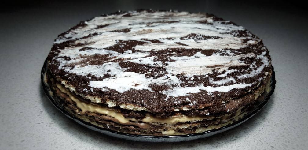 Вафельный тортик - вкус детсва 😊 Когда хочется домашнюю сладость здесь и сейчас😂🙈. Все очень просто и очень быстро. Ингредиенты: вафельных коржей, сгущённого молока, сливочного масла, Шоколадная глазурь, какао, белка, сахара, молока или воды, сливочного масла Способ приготовления: Итак начнём 😊 Банку сгущённого молока варим на медленном огне час. Есть готовая варёная, но она слишком плотная по консистенции и больше подойдёт для трубочек. Нам же нужен крем чуть гуще сметаны. Сварили, дали немного остыть, перелили в любую удобную ёмкость и добавив растопленное сливочное масло взбиваем миксером до однородной массы. Первая часть нашего крема готова. Начинаем готовить шоколадную глазурь: Какао, сахар, белки и молоко (если нет молока, с водой тоже вкусно получается) перемешиваем и ставим на медленный огонь. Постоянно помешивая, чтоб шоколад не пригорел. Как только шоколад загустел и изменил цвет, убираем с огня. Даём мин 5-10 остыть и добавляем сливочное масло. Мешаем до растворения масл