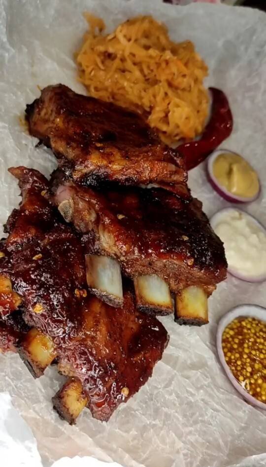 Очень вкусные и нежные рёбрышки, готовятся не сложно, а ваш мужчина скажет вам спасибо за такой ужин😉с бокалом пенного вообще огонь. Ингредиенты: Ребра свиные, Соль , Чеснок сушеный, Паприка сладкая, Перец черный молотый, Перец Чили, Джем вишнёвой, Соевый соус, Сок 1/2 лимона, Растительное масло Способ приготовления: С ребер обязательно снять пленку, она легко снимается при помощи бумажного полотенца. Подцепляем ее ножом, берём за край бумажным полотенцем и просто стягиваем. Ее нужно убрать обязательно, чтобы ребра были нежными и мягкими. Выстилаем три слоя фольги и выкладываем на нее рёбрышки. С каждой стороны сбрызгиваем растительным маслом, солим, перчим по вкусу и посыпаем сладкой паприкой и сушеным чесноком. Плотно заворачиваем плотно в фольгу и отправляем в разогретую до 180°С духовку на 2 часа. В это время готовим глазурь, тут все на глаз) вишневый джем, соевый соус, перец черный и перец Чили, сок лимона, сладкая паприка. Все перемешать и оставить настаиваться. Через 2 часа рёб