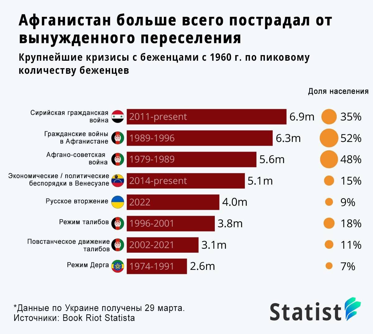 За период с 1960 по 29 марта 2022 года, самым большим по количеству беженцев кризисом оказалась война в Сирии: 6.9 миллиона жителей этой страны были вынуждены покинуть свои дома, что составляет 35% от всего населения По относительным цифрам лидирует Афганистан: в период гражданской войны начала 90-ых его покинуло 52% населения страны, а в период ввода советских войск эта цифра была немногим ниже: 48% Текущая война в Украине уже стала пятым по величине источником беженцев последних десятилетий: порядка 4 миллионов человек (9% населения) уже покинули страну