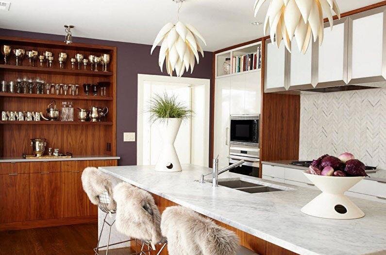 Выбирая материал для оформления столешницы на современной кухне с островом, присмотритесь к дереву или мрамору. Главная задача – найти то покрытие, которое будет максимально фактурным. Натуральный камень – прекрасный вариант, учитывая благородный рисунок и глянцевое покрытие такой столешницы. Для классического стиля кухни необходимо выбирать остров исключительно стационарный. Это должна быть крупная устойчивая тумба. Предпочтительнее использовать прямоугольную форму столешницы, можно выбрать дизайн с закругленными углами. Над таким островком на кухне эффектно будет выглядеть как большая вытяжка, так и крупная люстра с мелким декором из хрусталя.