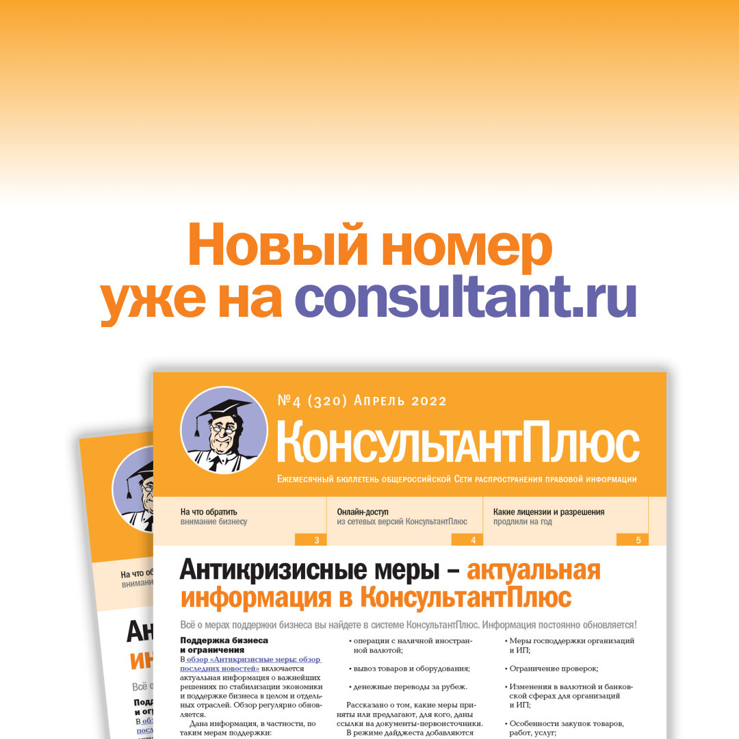 Читайте в новом выпуске бюллетеня КонсультантПлюс: 🔹Антикризисные меры - актуальная информация в КонсультантПлюс 🔹Региональные антикризисные меры 🔹На что обратить внимание бизнесу 🔹Онлайн-доступ из сетевых версий системы КонсультантПлюс 🔹Какие лицензии и разрешения автоматически продлили на год 🔹Новый студенческий квест КонсультантПлюс: "Судебная система: изучай, проверяй" Перейти к выпуску https://www.consultant.ru/about/presscenter/bulletin/y2022/m04/ #консультантплюс #бюллетень_консультантплюс